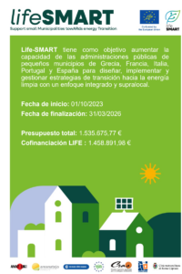 El Proyecto LIFE SMART ( Support Small Municipalities towards Energy Transition ) tiene como objetivo fortalecer de la capacidad técnica y organizativa de pequeños municipios para europeos para diseñar, implementar y gestionar planes y estrategias de transición energética, en línea con el Pacto de las Alcaldías. LIFE SMART se desarrolla en municipios de España, Francia, Grecia, Italia y Portugal.